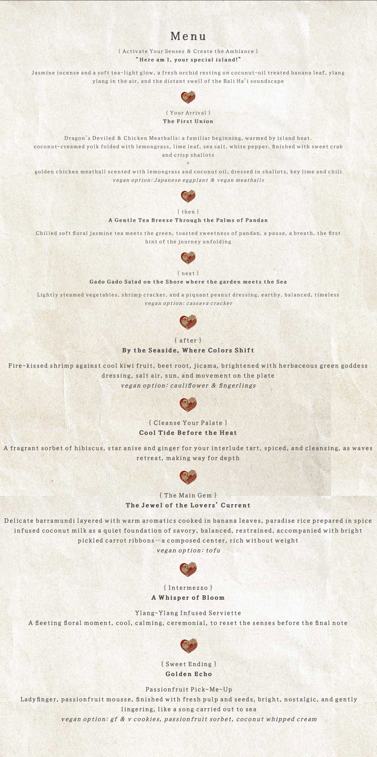 Bali Ha’i is a story of longing, of love shaped by distance, difference, and the courage to choose one another despite what stands in the way. That current runs through this menu. In a folklore storytelling, barramundi is sometimes described as a lovers’ fish, symbolizing transformation and shared passage between river and sea. It reflects Chef Gina’s own lineage, and her own life stories, where love has meant crossing cultures, geographies, and expectations to remain whole. Each course is offered as a movement through that journey guided by memory, restraint, and the belief that love endures by moving forward together.